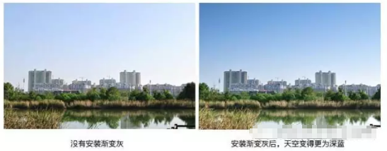 GDN鏡,是這樣的一塊透明的樹脂玻璃,上面從頂部至中間的部分染了灰色,而這個灰色就猶如Photoshop當中的過渡工具拉出來的效果一樣,是從上到下(灰色)逐漸變淡的。而灰色對于光線有均勻吸收的特點。因此當我們把這片鏡片放到鏡頭前面時,便會發(fā)現(xiàn),天空的亮度被減弱了。
