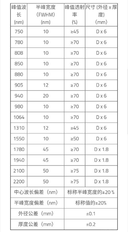 X-射線至近紅外區(qū)域的截止背景高于OD4、外徑尺寸從8mm至60mm,當(dāng)然如果您有需求在小于60mm或其他形狀帶通濾光片,